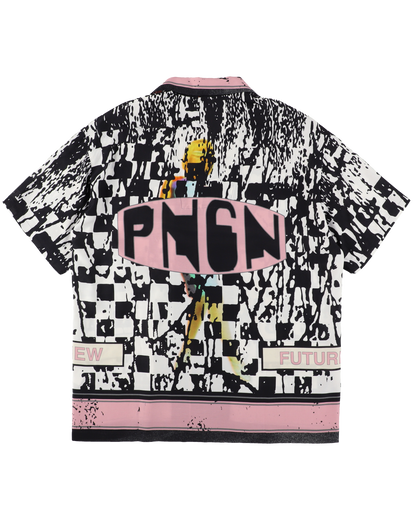 This free-size, graphic rayon aloha shirt features vibrant prints, all produced domestically in Japan. The shirt is like wearing a piece of art, offering enjoyment just by looking at its playful motifs. Despite the chaotic graphic design, the careful detailing along the collar, hem, and placket brings balance, elevating it to a luxurious yet playful look.