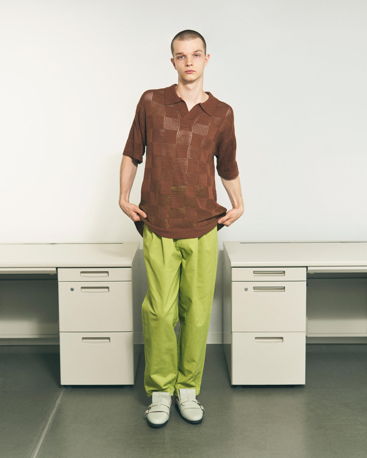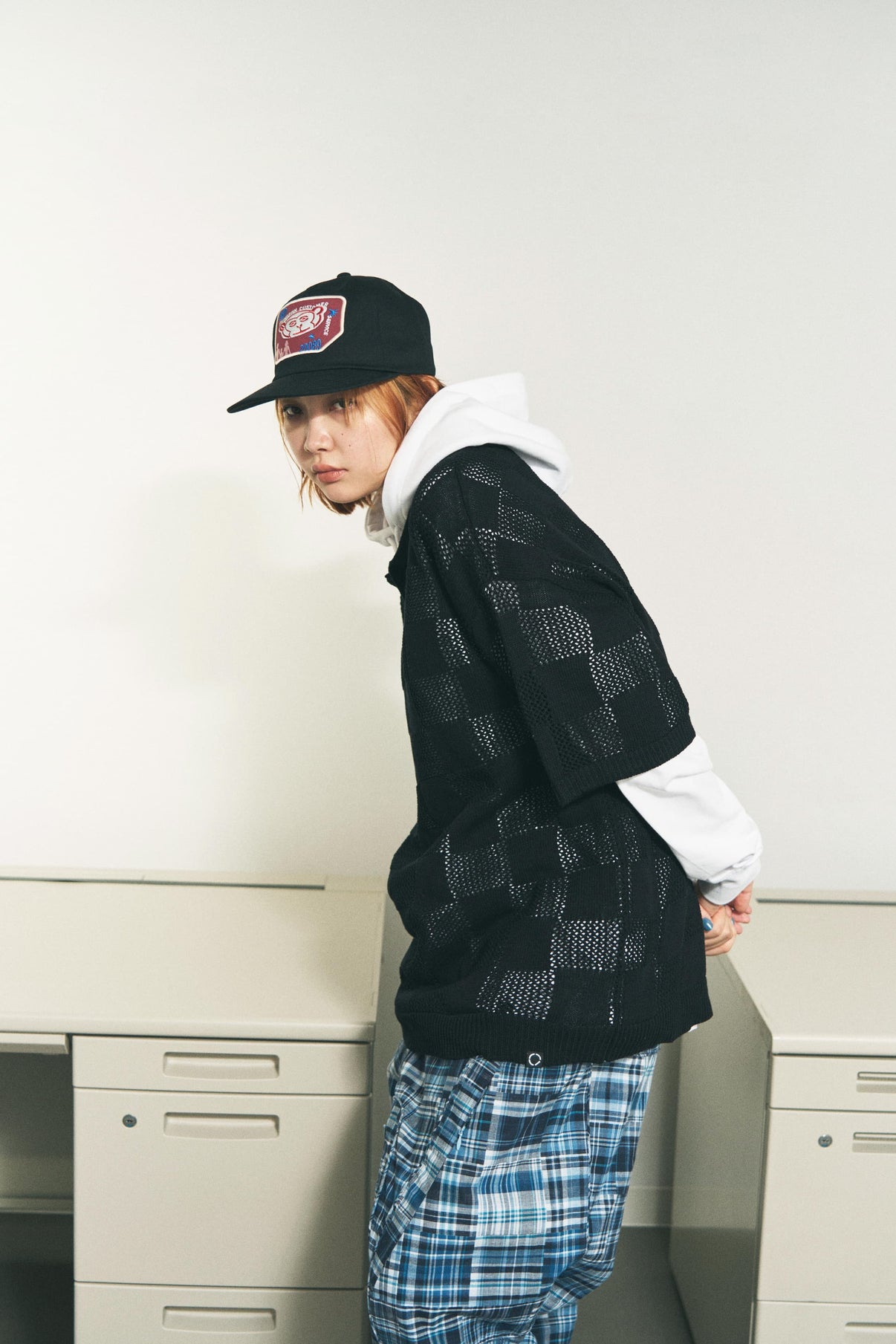 A sheer semi see-through knit crafted with two types of gradient knit work to reinterpret the classic checkerboard pattern. Varying levels of transparency add depth, introducing a fresh approach to layering . Ideal for pairing with your favorite graphic tees, or undergarments. Its soft, mosaic like sheerness keeps it light and breathable even when worn on its own.