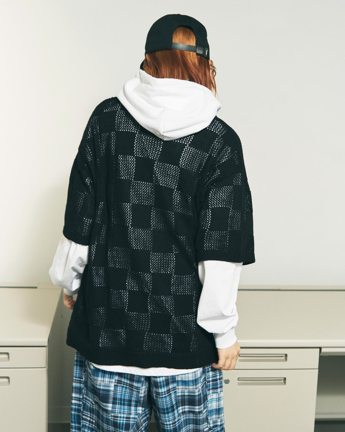 A sheer semi see-through knit crafted with two types of gradient knit work to reinterpret the classic checkerboard pattern. Varying levels of transparency add depth, introducing a fresh approach to layering . Ideal for pairing with your favorite graphic tees, or undergarments. Its soft, mosaic like sheerness keeps it light and breathable even when worn on its own.
