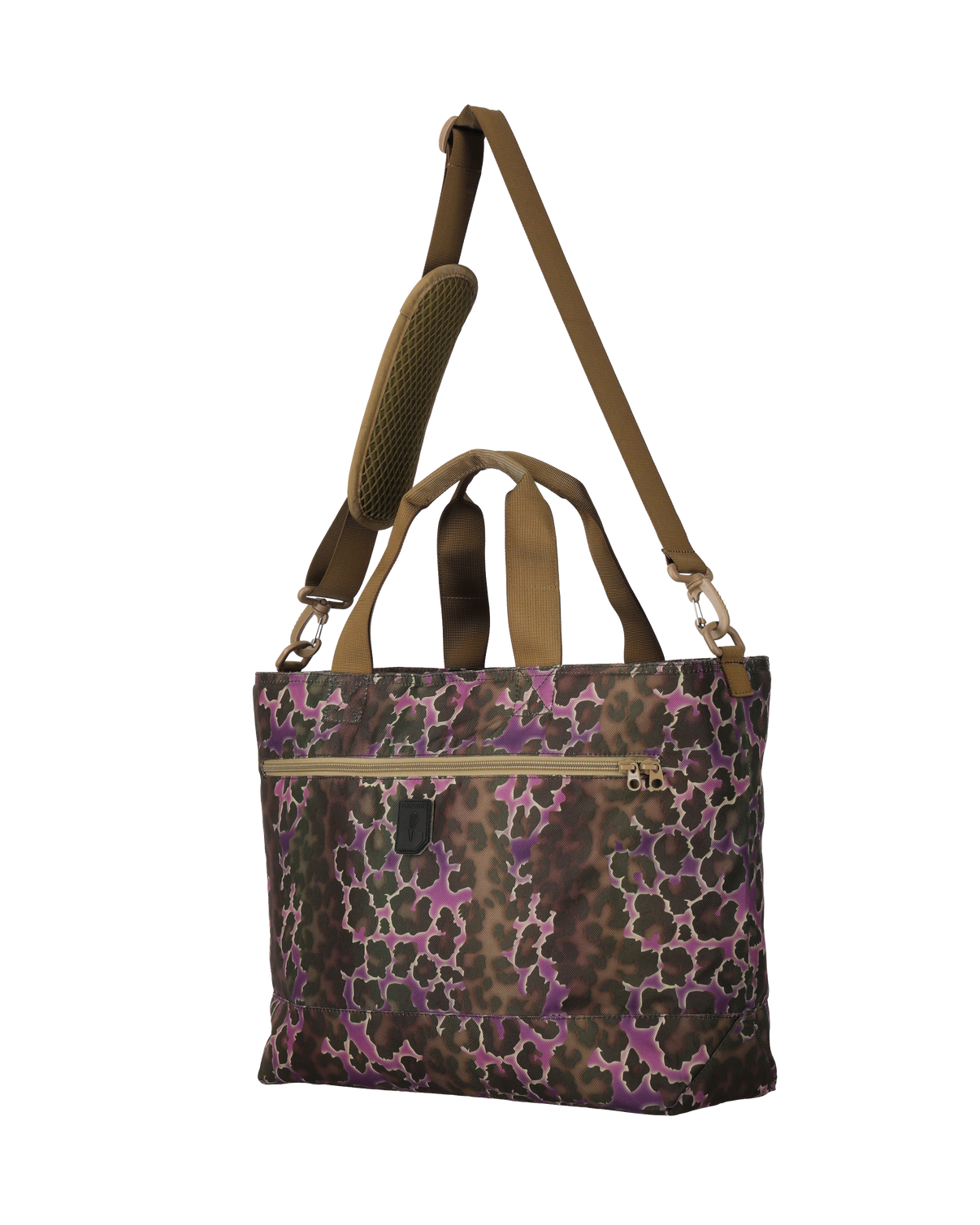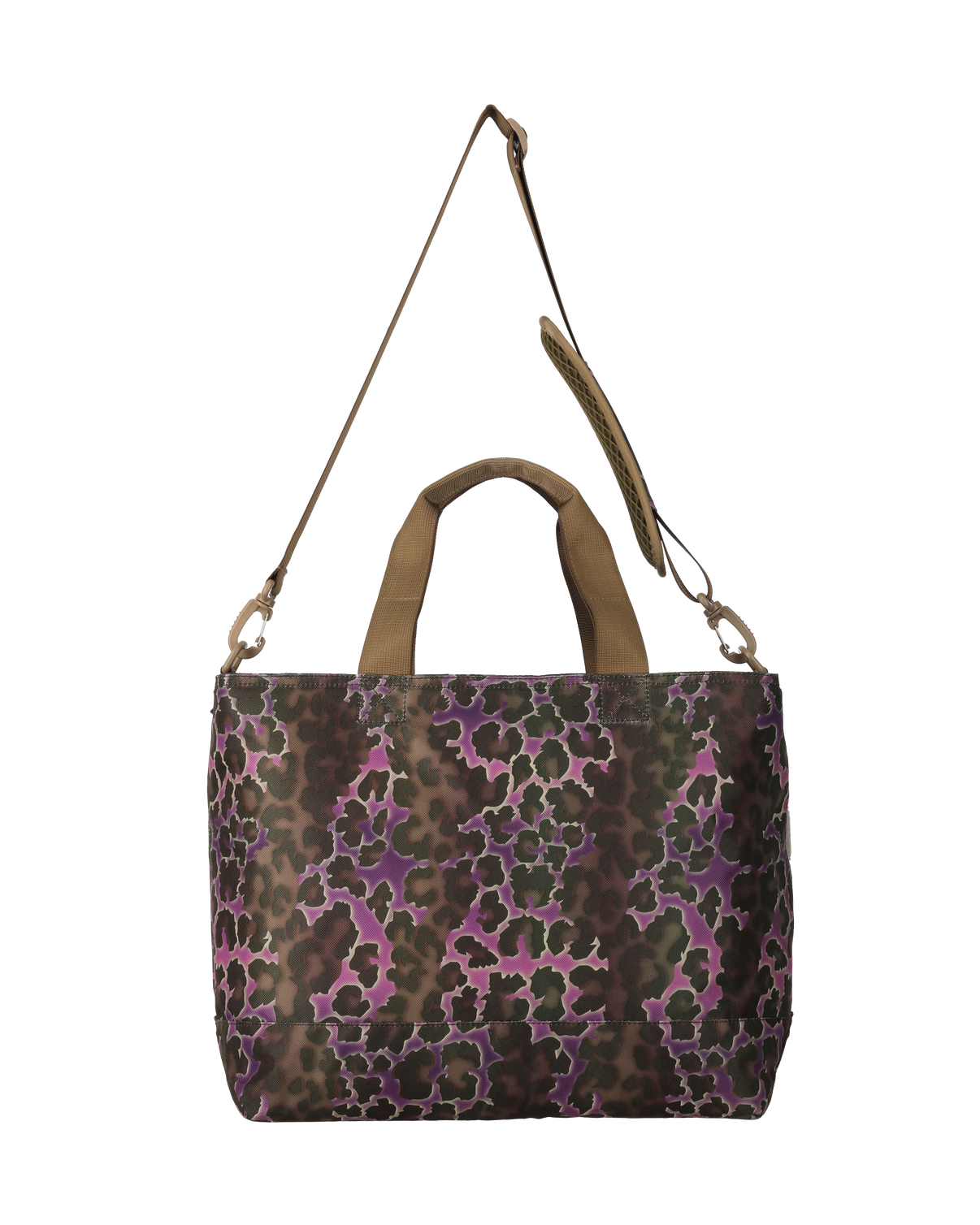 パープル基調のとてもクールでストレンジなオリジナルレオパード柄をフィーチャーした、ユーティリティトートバッグ。 ラップトップをはじめ大きいもの、たくさんのものをまとめて入れてもらうおうのに最適な大口のショルダートートバッグ 裏地付きで物も取り出しやすく、テーラジャケットなどのバックパックを使用しないマチュアな着こなしにもおすすめです。