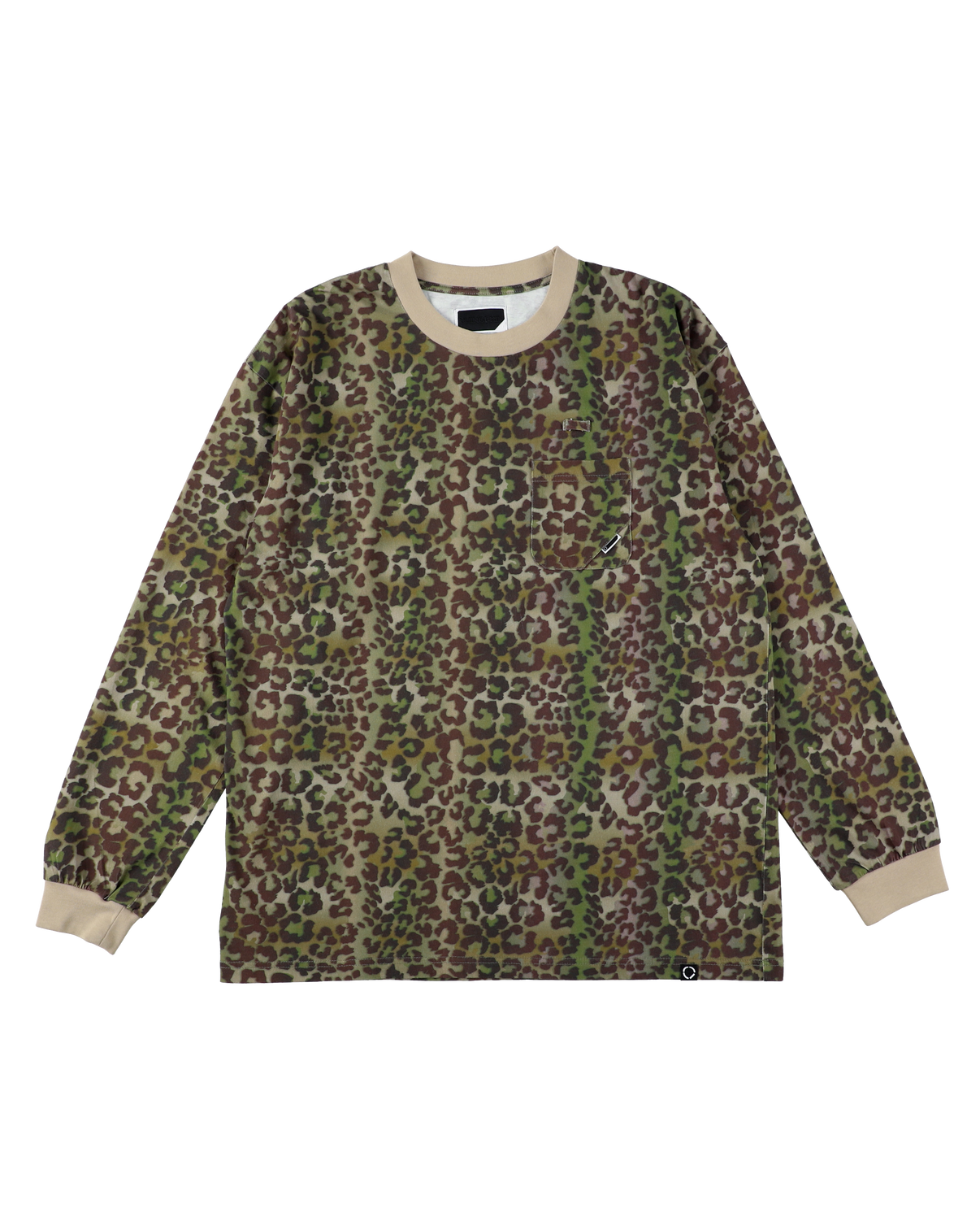 A long sleeve pocket T-shirt in PHINGERIN’s original leopard print, now updated with a fresh army-inspired color theme. Featuring an optical loop, perfect for holding eye c u sunglasses or other eyewear. Convenient for everyday glasses too. Simple in appearance but thoughtfully designed with a product-focused approach. Original artwork by Ryusuke Marume.