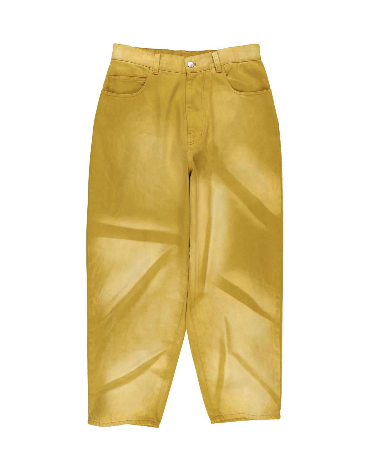 PHINGERIN’s signature jeans reinterpret the classic 5-pocket silhouette with a playful twist; a discreet sixth pocket tucked at the center of the back pocket, earning them the name “6 POCKET JEANS.” While the design remains understated, this unexpected detail serves as a bold accent. This laser treated color denim is available in a vibrant lime green and red, each pair is finished with contrast stitching to highlight its character. The back pockets are set slightly lower than standard, making them a standout feature when styled to be seen. With a clean tapered silhouette, the jeans maintain a sharp look even when worn with a relaxed fit, perfectly balancing both casual and refined looks.