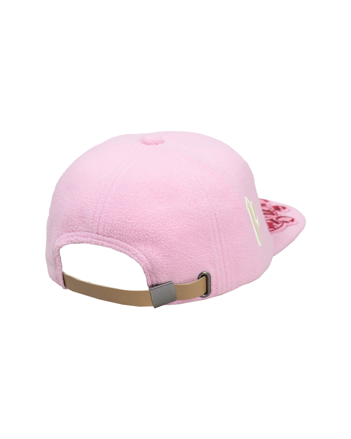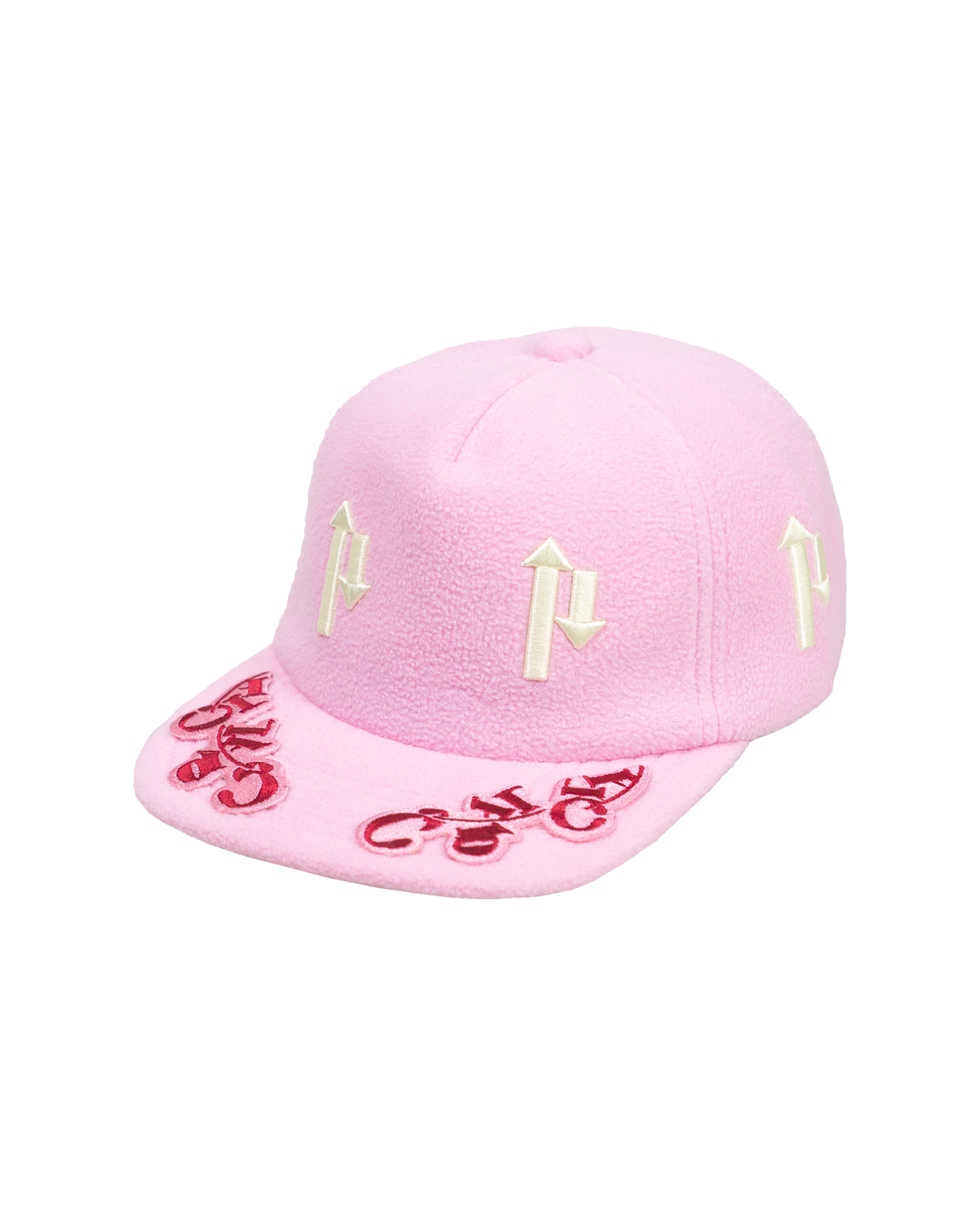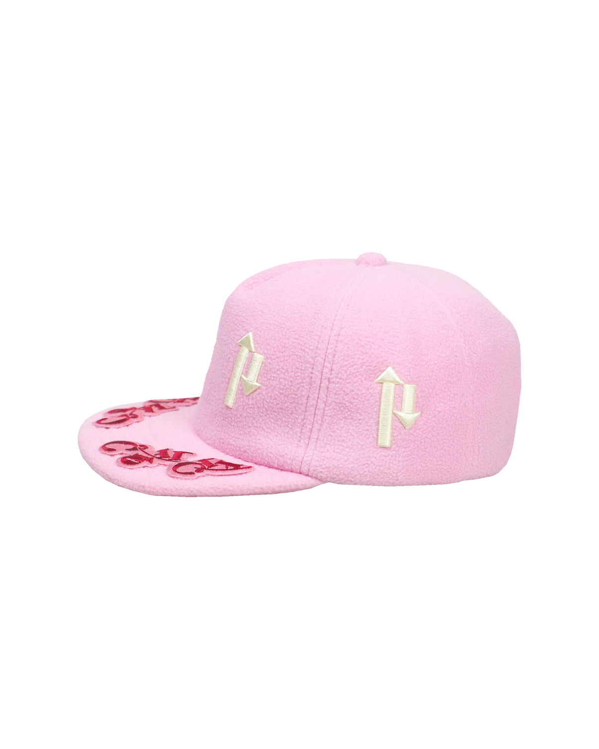 A winter baseball cap featuring three-dimensional “P” embroidery, expressed as arrows, scattered across the front panel. Warm textured fleece paired with a solid pink.
