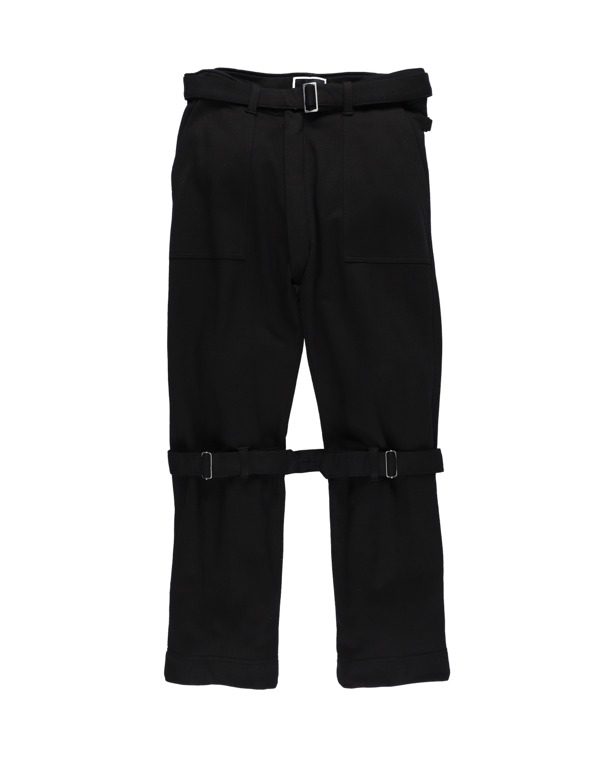 The iconic BONDAGE PANTS return with a major update. Maintaining their bold presence, they’re now crafted in a heavyweight sweatshirt fabric for a new level of comfort. Signature elements like the connecting straps and metal hardware remain, while the addition of a bum flap introduces an even more authentic twist. Available in classic heather grey, navy, and black, please enjoy this iconic piece.