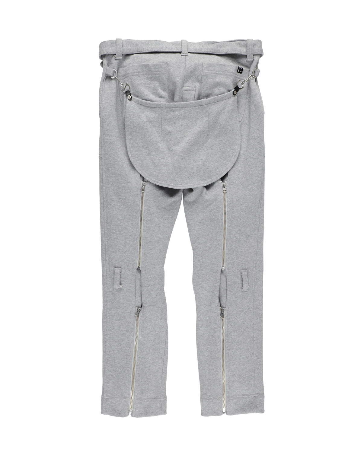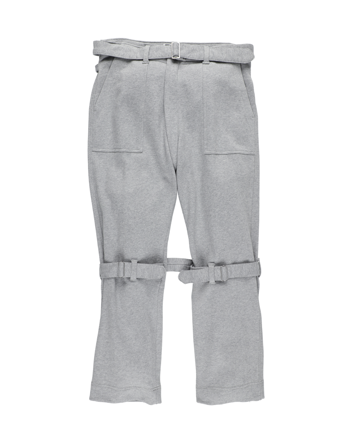 The iconic BONDAGE PANTS return with a major update. Maintaining their bold presence, they’re now crafted in a heavyweight sweatshirt fabric for a new level of comfort. Signature elements like the connecting straps and metal hardware remain, while the addition of a bum flap introduces an even more authentic twist. Available in classic heather grey, navy, and black, please enjoy this iconic piece.