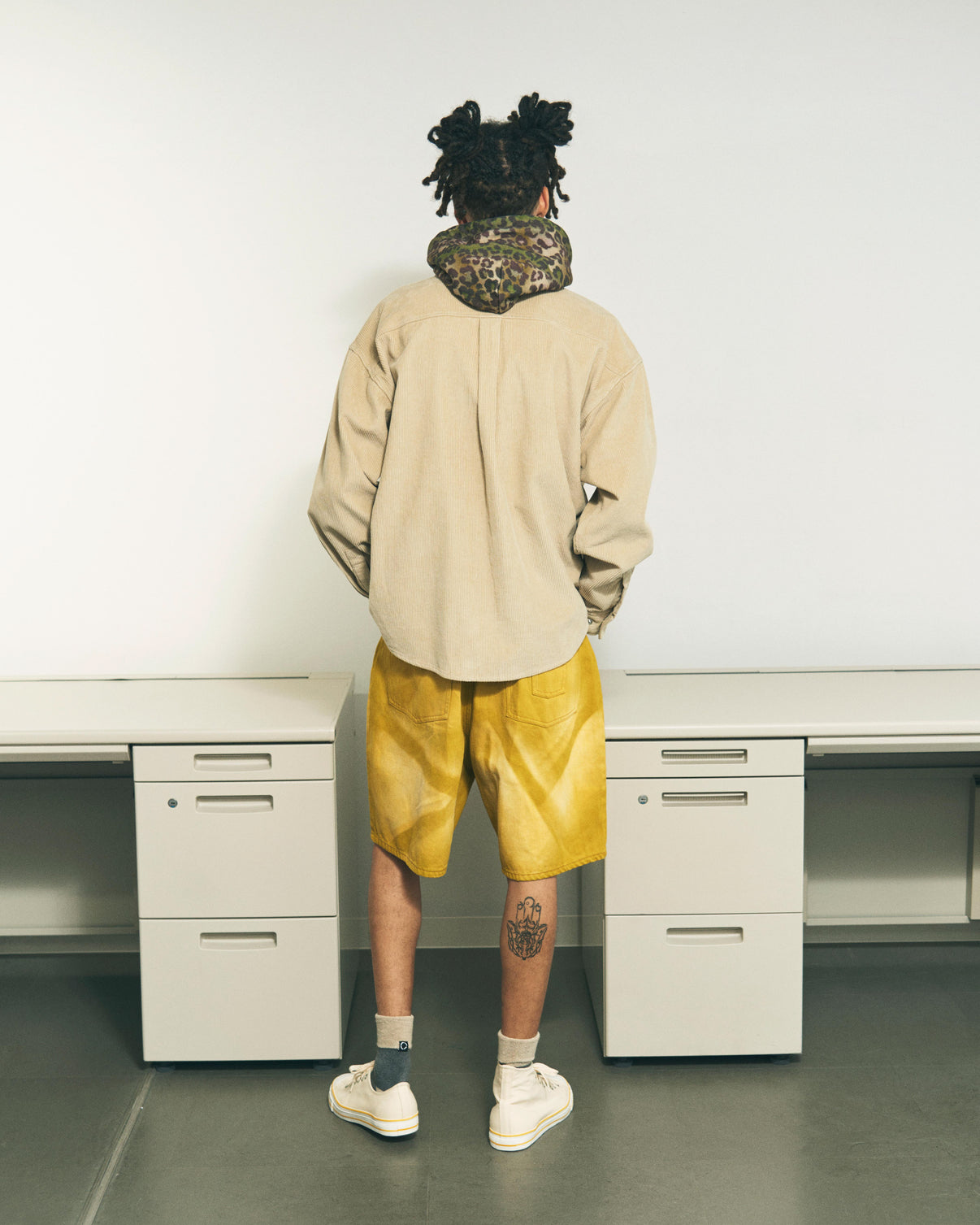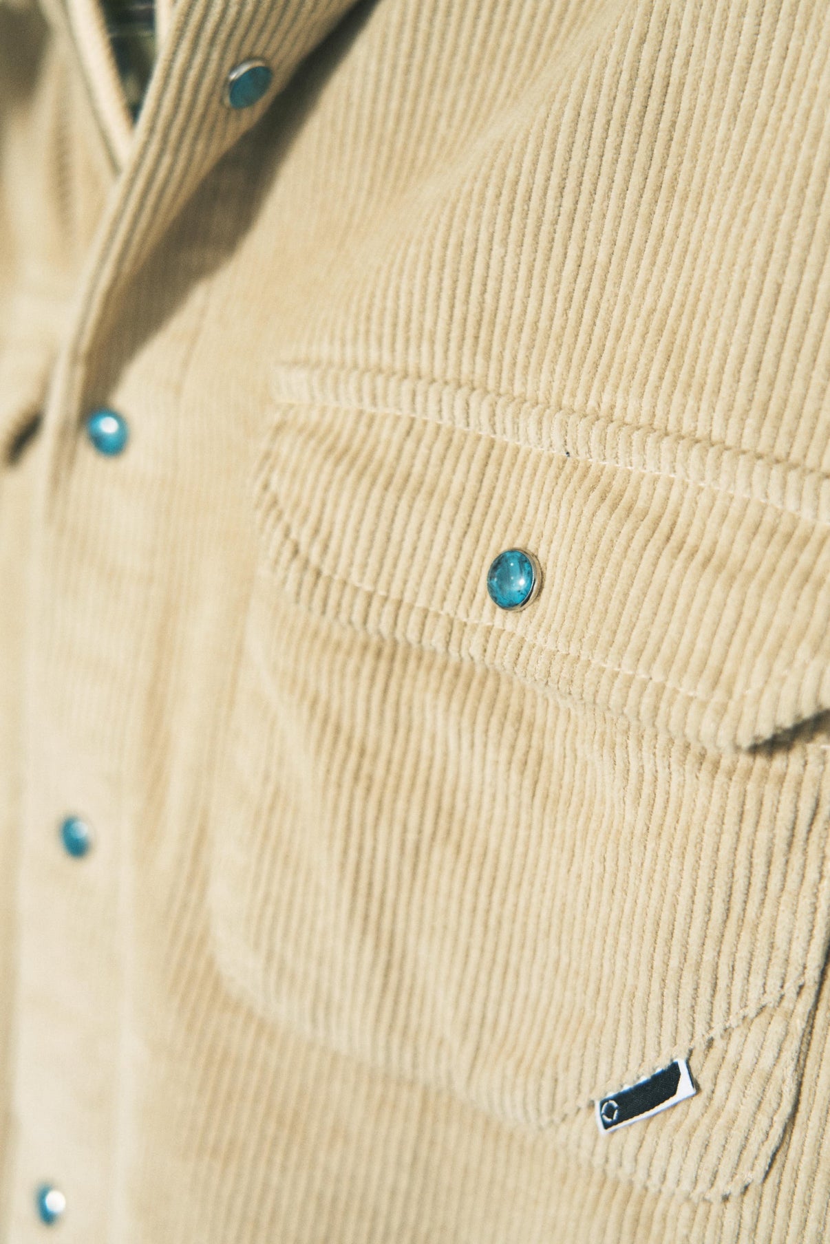 A basic mid-century inspired corduroy shirt featuring standout turquoise style western buttons. Designed with a gently curved hem and boxy silhouette, it works effortlessly as both a shirt and a lightweight jacket.