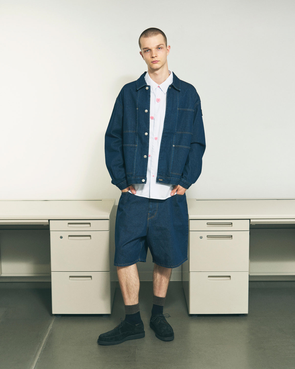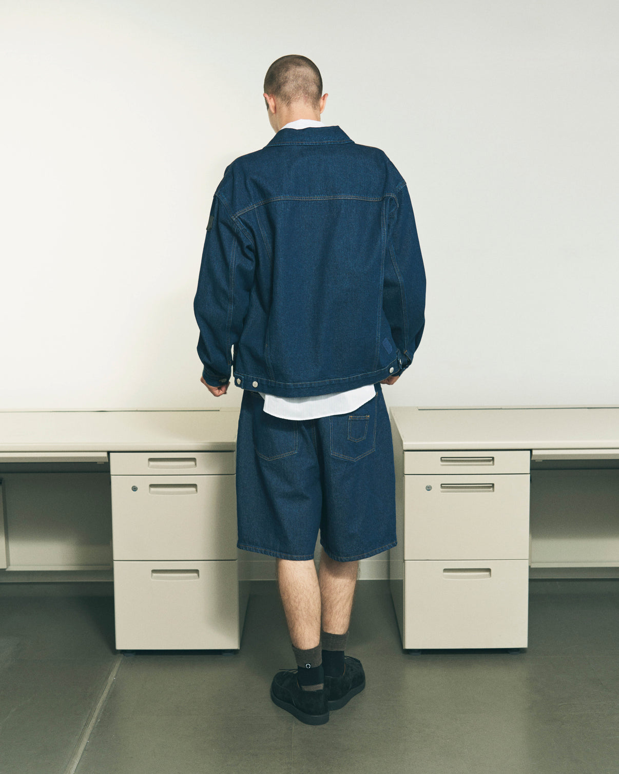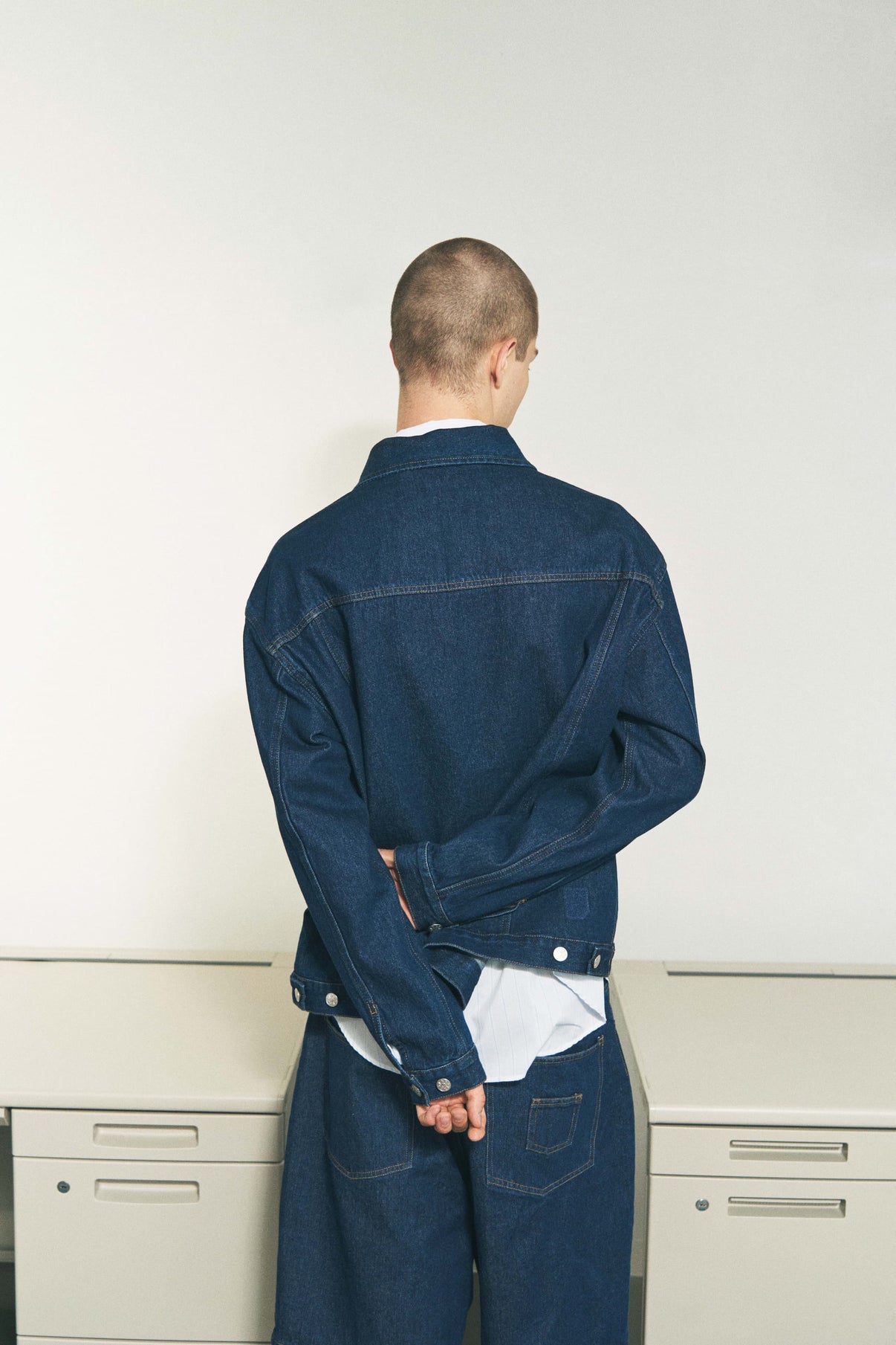 A hybrid denim jacket featuring an original design with each color treated through bleach and heavy wash processes. Despite its rugged finish, the concealed front placket keeps the look clean. Antique style square pockets with rivets, double-layered sleeves, custom buttons, and the signature silicone patch come together in a fresh remix of classic denim. The dry, relaxed texture makes it an easy favorite for spring and summer.