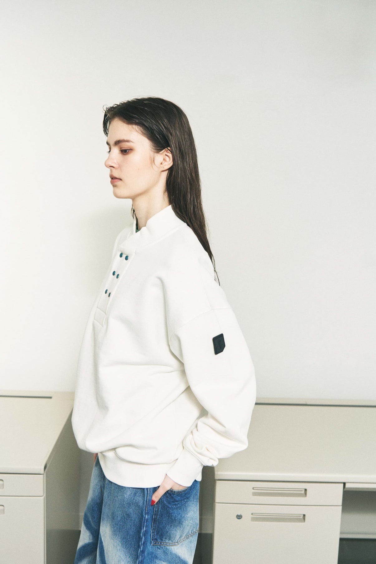 A classic Henley style sweatshirt with a double front button design, updated this season with standout stone buttons as a key detail.
