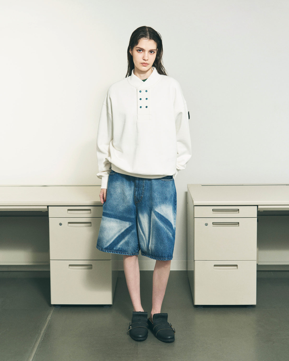 前開きボタンが2列になった定番ヘンリースウェット、 今回はストーンボタンがポイントです。