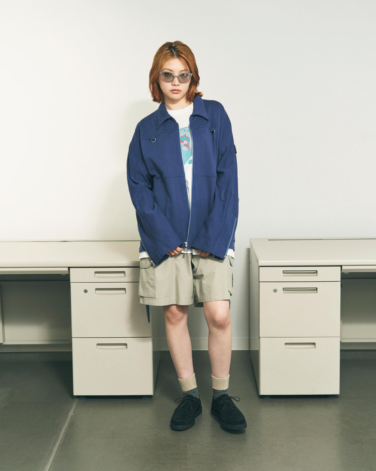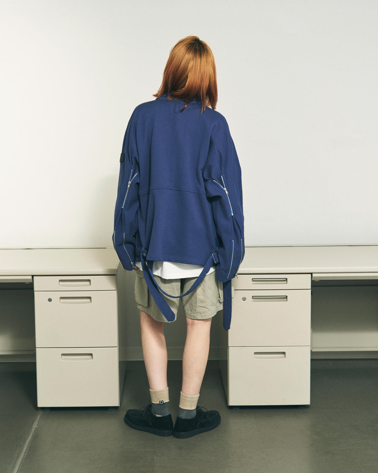 分厚すぎないスウェット素材で作り上げた、PHINGERINのアーカイブピースであるZIP RUN JACKET、 もしボンテージパンツをジャケットとして羽織ったら、というところから着想され、モーターサイクルジャケット型に昇華したユニークなピース。 袖の太さはファスナーで、ウエストはストラップで、幅を調整できます。柔らかい肌触りですが起毛させていないスウェット素材なのでスリーシーズン対応の便利でパンキッシュなソフトジャケットです。