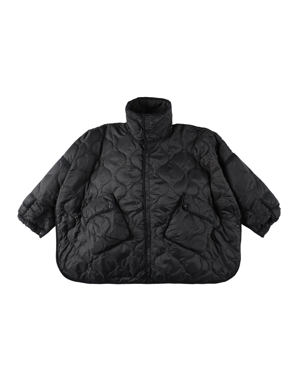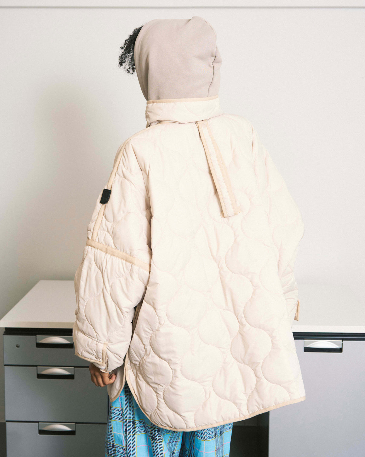 ピーチタッチのポリステルを使用した薄めのキルト中綿でふくらみすぎない、軽くスタイリッシュな雰囲気のライトフトンコート、ノンミリタリーカラーで作成した、ライナーキルト、配色綾テープもユニークな雰囲気。名前の通り、スナップを広げると体全体にかかるサイズまで広げて腰を下ろす事もできます。