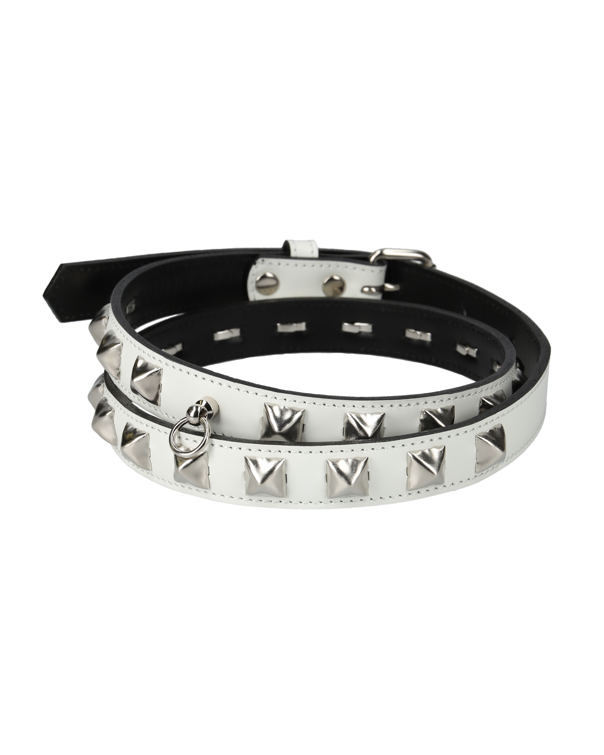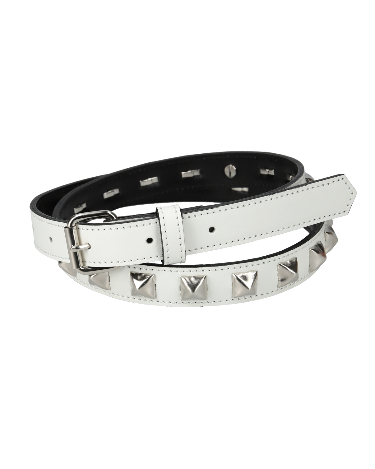 Our signature leather studded belt is back in WHITE, PINK, BLACK and a new suede LILAC. The studs are placed evenly one by one, giving it a fun and rustic feel. Lightweight so it is easy to wear casually, even if you don't have a punkish style. Included is a D-ring for keys or other accessories as well.