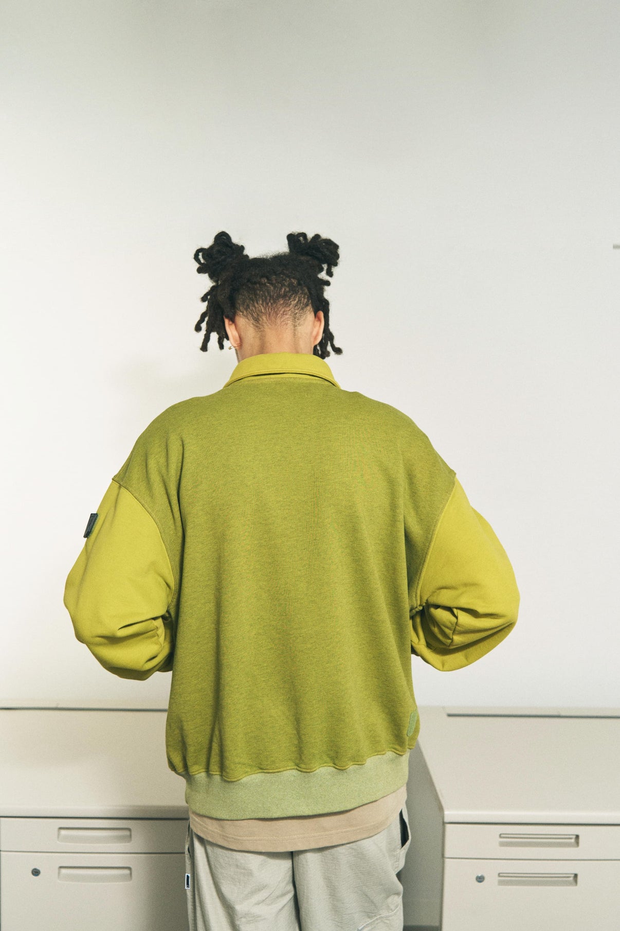 杢グレーと袖を別色で切り替えたスウェットをオーバーダイし、それぞれのパーツのナチュラルな切り替えを楽しめる、 ワントーンの配色スウェット、プルオーバーのハーフジップスウェットです。襟付きの上品なルックがポイント。