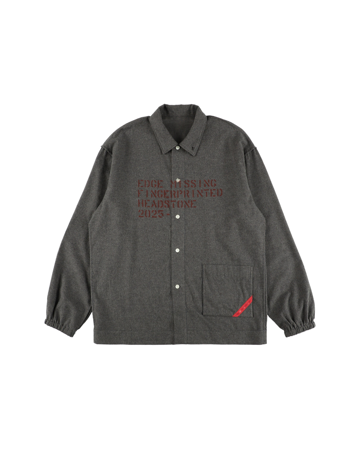 PHINGERINのアイコンをミリタリー風のテキストであらわした、EMFHの文言がステンシルアーティストRyusuke Marumeによるハンドスプレープリントされています。 ストローク、 ポケット形、蓄光ハートボタンなど、PHINGERINのステートメントが詰まったオリジナルパジャマトップ、少しコージーな雰囲気のスモーキーなストライプ生地です
