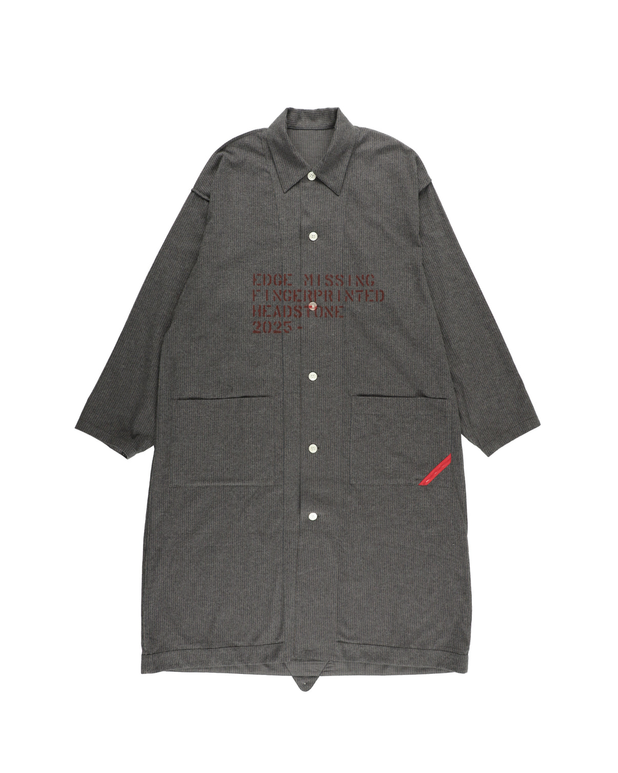 PHINGERINのアイコンをミリタリー風のテキストで言語化した、EMFHの文言がステンシルアーティストRyusuke Marumeによるハンドスプレープリントされています。 ストローク、 ポケット形、蓄光ハートボタンなど、PHINGERINのデザインステートメントが詰まったオリジナルパジャマスリーパー(ワンピースパジャマ、少しコージーな雰囲気のスモーキーなストライプ生地です