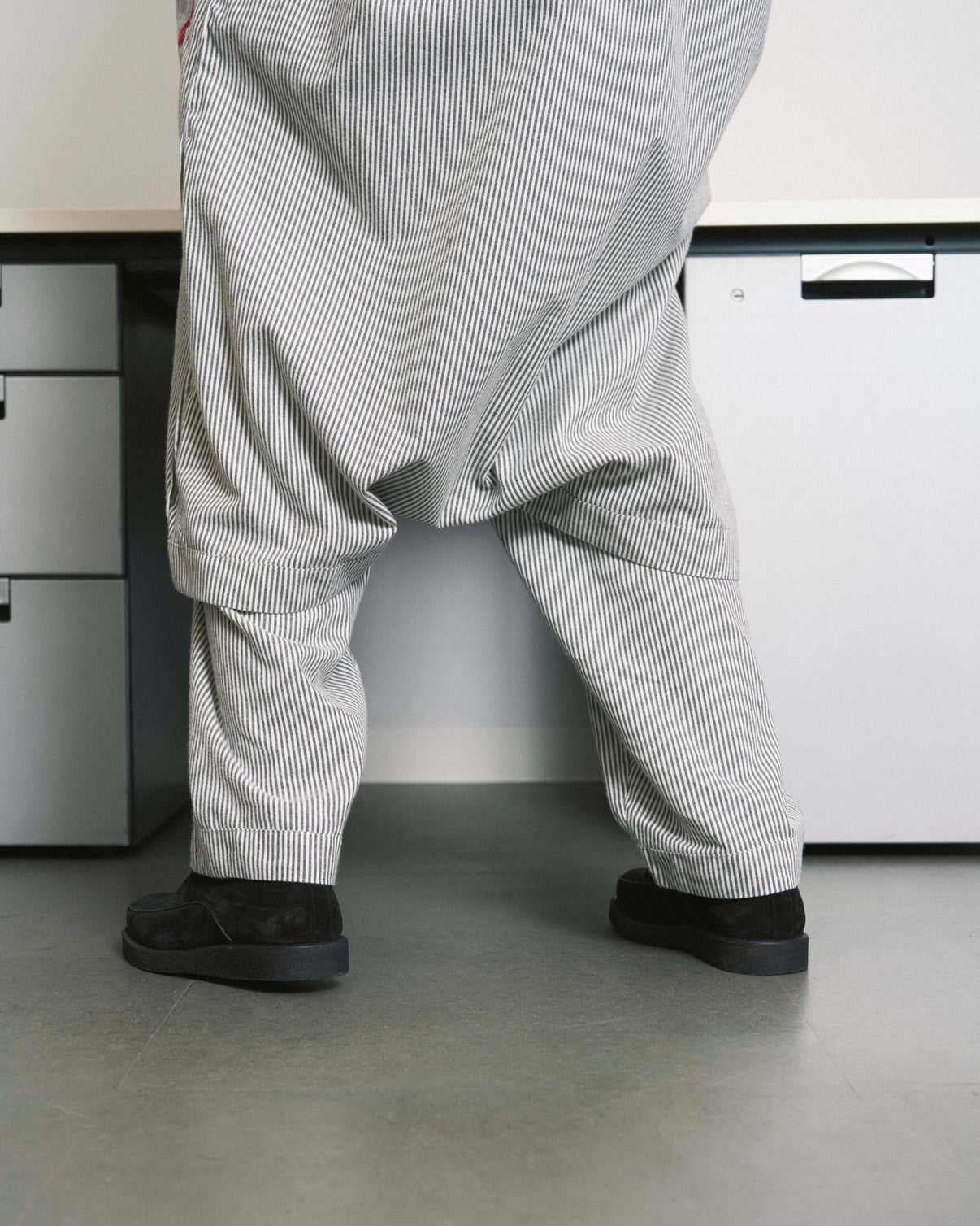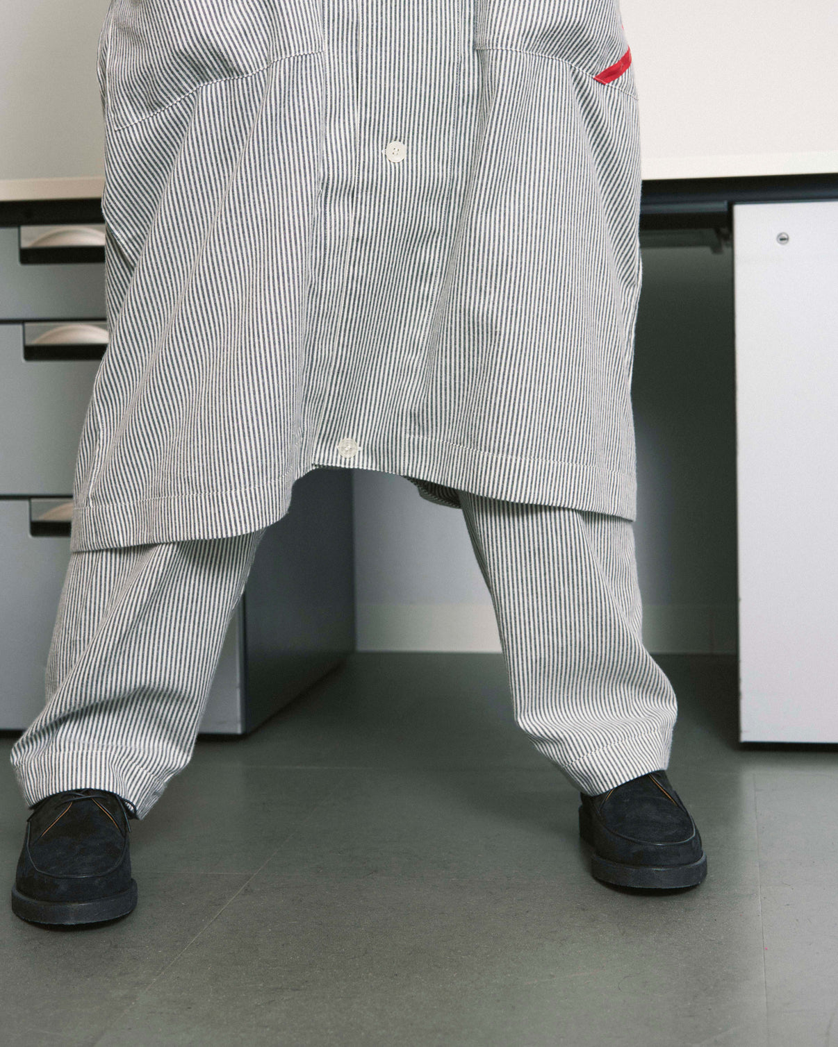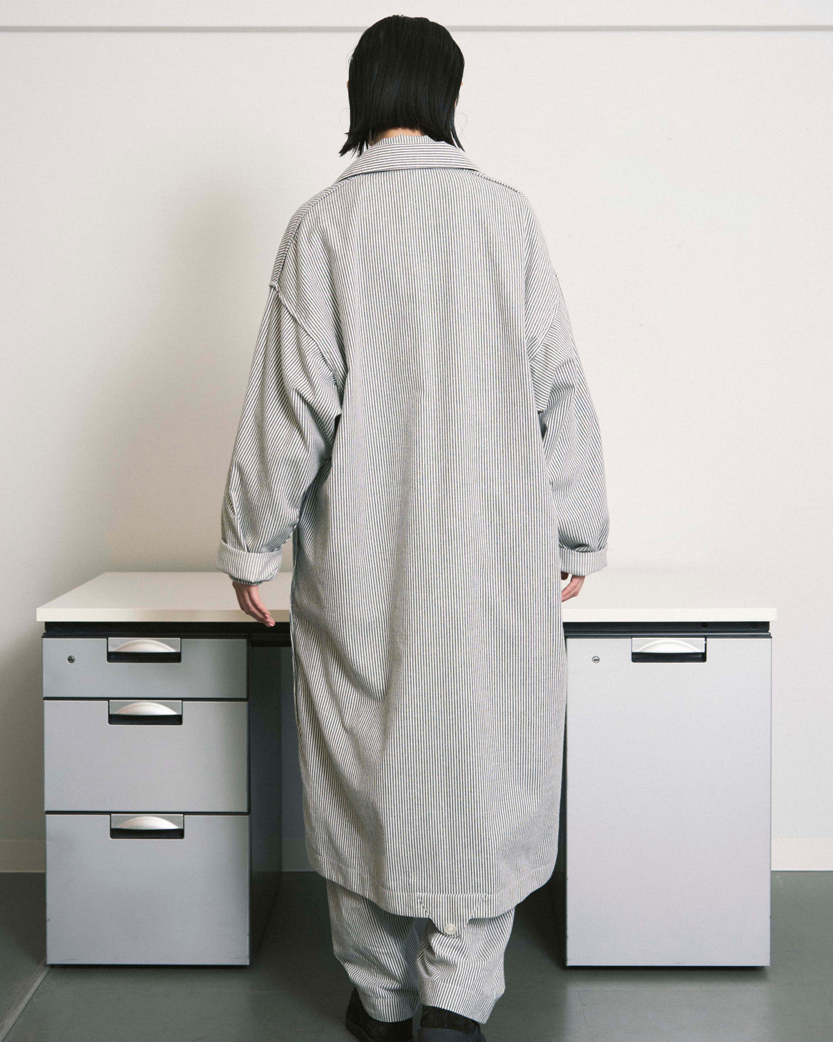 PHINGERINのアイコンをミリタリー風のテキストで言語化した、EMFHの文言がステンシルアーティストRyusuke Marumeによるハンドスプレープリントされています。 ストローク、 ポケット形、蓄光ハートボタンなど、PHINGERINのデザインステートメントが詰まったオリジナルパジャマスリーパー(ワンピースパジャマ、少しコージーな雰囲気のスモーキーなストライプ生地です
