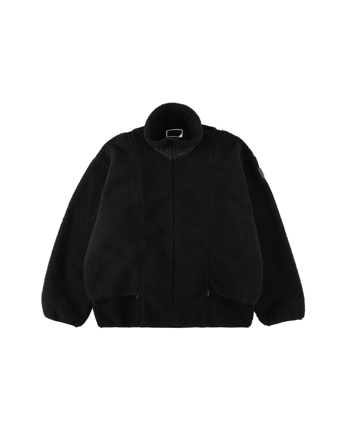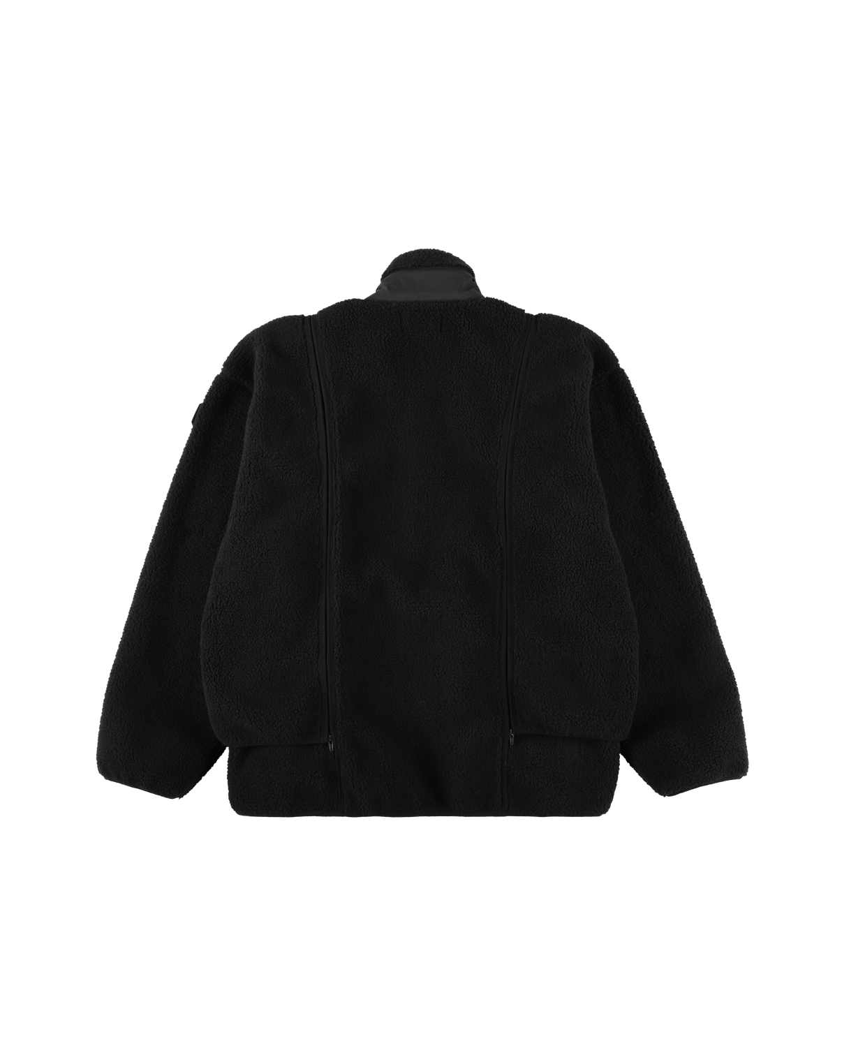 A signature PHINGERIN piece that transforms from a jacket to a vest with zippered shoulders. Its modern volume contrasts beautifully with the retro fleece fabric. Unlike traditional designs that detach at the shoulder seam, this jacket utilizes a front zipper system that allows the whole front shoulder/ sleeve panel to be removed as one. When the sleeves are attached, partially opening the long double zipper reveals a front waist pocket. This highly practical design also features a floating pocket cover when the zipper is fully closed.