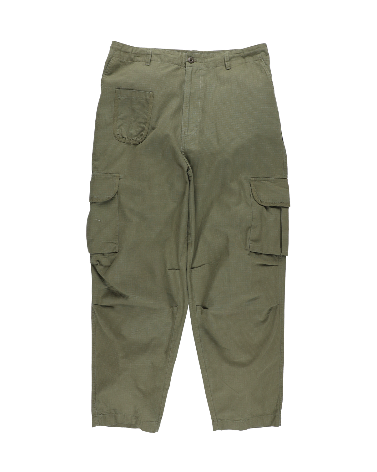 Rugged yet refined, these cargo pants are made from a smoky-toned military ripstop fabric. Thoughtfully designed with detailed pocket trims and a sharp silhouette, they balance utilitarian elements with a clean, city-ready finish.