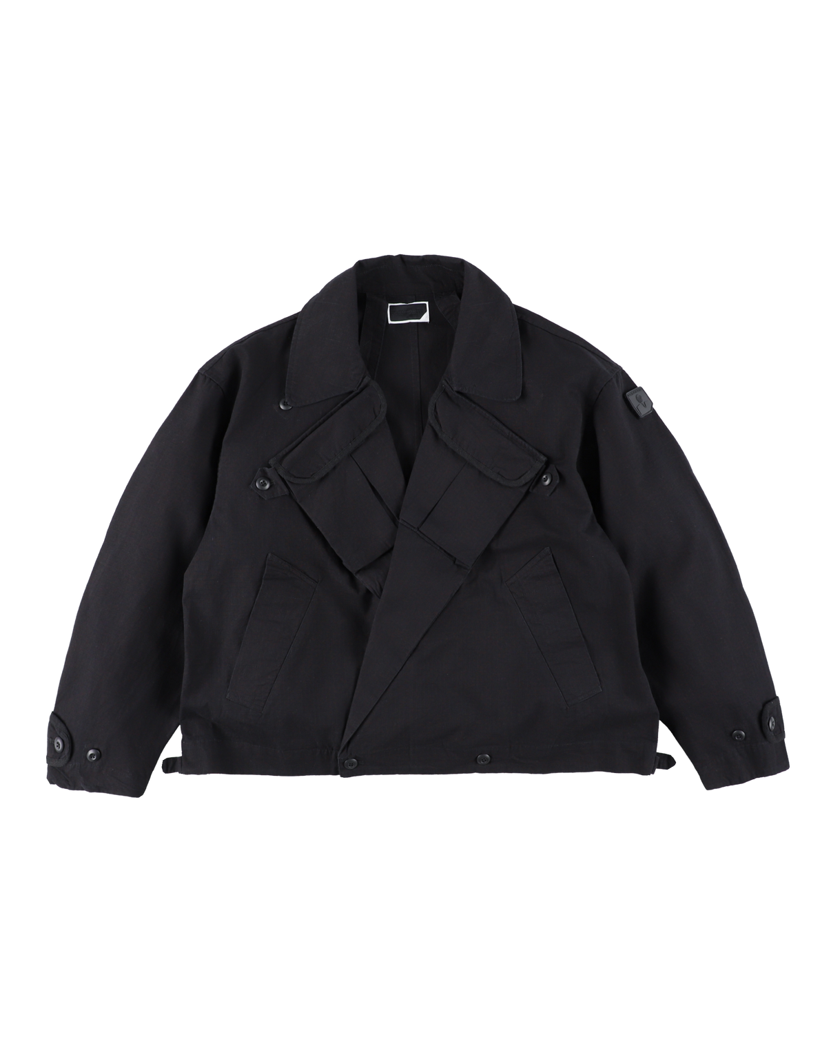 ラギッドな生地感とスモーキーな色合いのミリタリーリップストップ生地を、繊細にデザインされたショートコートに採用しました。ラペルに見返し仕様のフラップポケットが配置されたとてもユニークなオリジナル型のコートですが、アンティークのような素材感によってかつて存在したかもしれないニューレトロなジャケットに仕上がっています。前端閉じのボタンは削ぎ落とされ、襟のはためきをおさえる左右のタブを外し、それぞれ反対側に配置されたボタンに留める事で、収まり良くフロントが留まります。 閉じるとフロントに一切開きが無い状態が作られ、せき止められる箇所が少ないため、ドレープも美しく存在感のある出立ちを楽しめます。ウエスト後方のストラップでキュッとウエストを締める事でシルエットに変化をつけることも。ユーティリティとスタイリッシュさを併せ持ったニューウェアです。