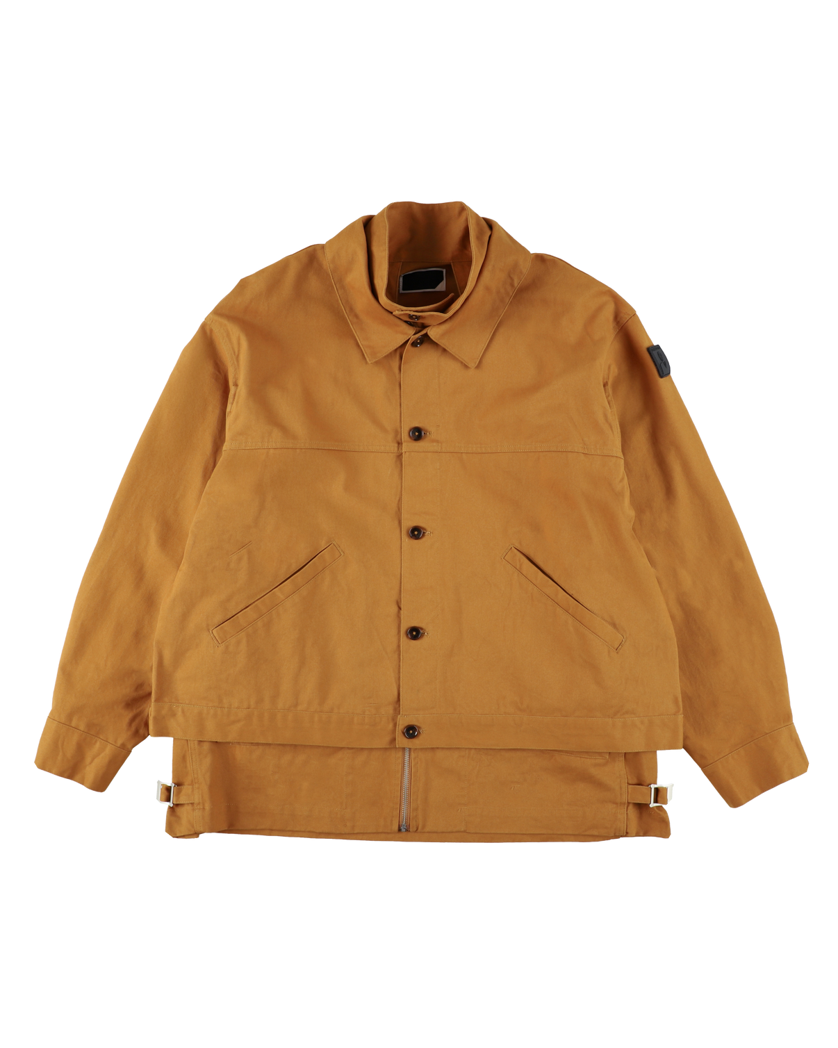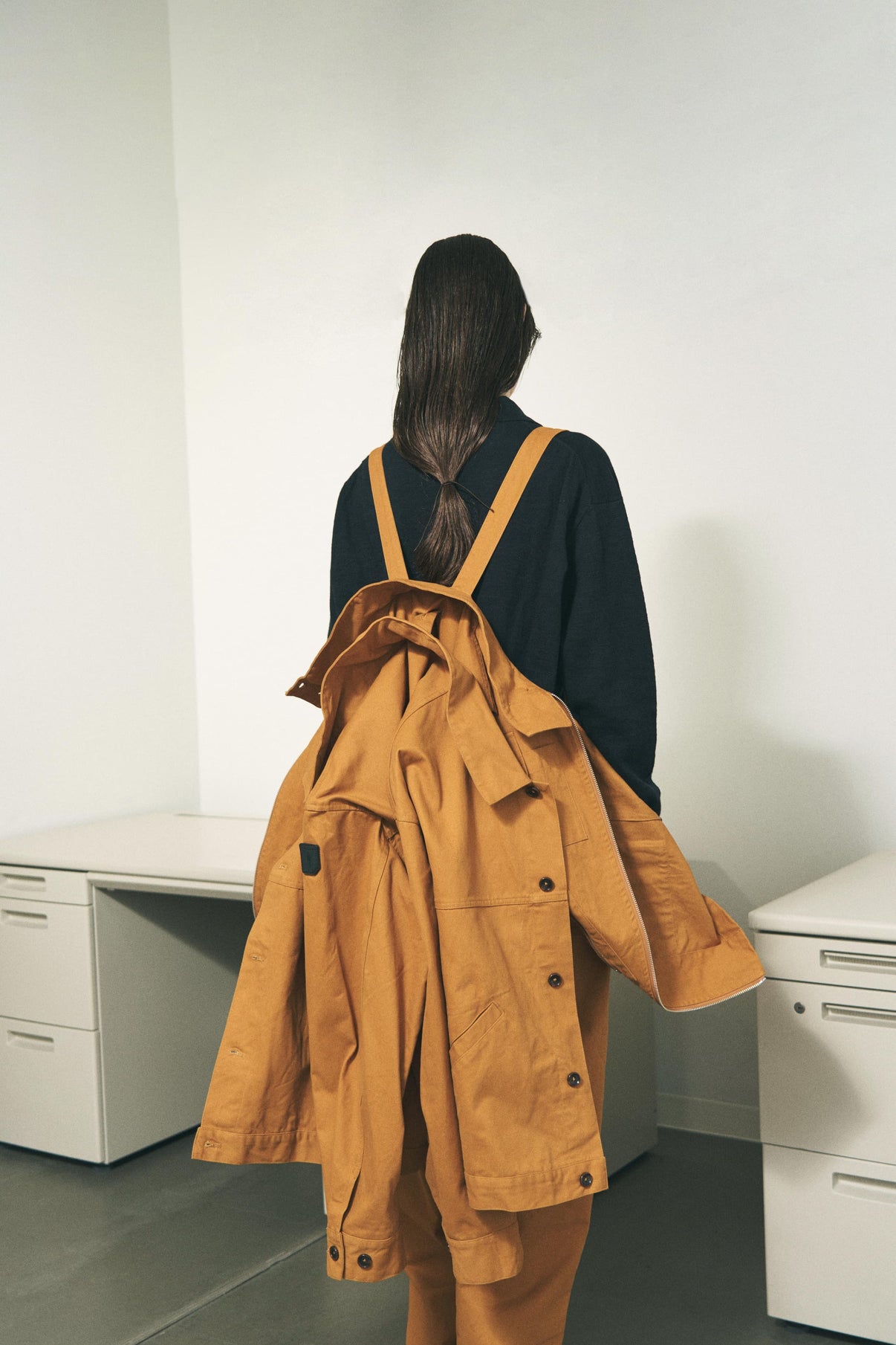 A unique workwear inspired jacket that layers a short coat over a longline vest, crafted from glossy, sturdy twill chino. The vest peeks through with utility details and contrast hardware, adding depth and a nice volume. Each layer stands strong on its own, offering multiple styling options. Reversing the order brings the vest’s design to the forefront. A detail-rich staple made to be worn your way.