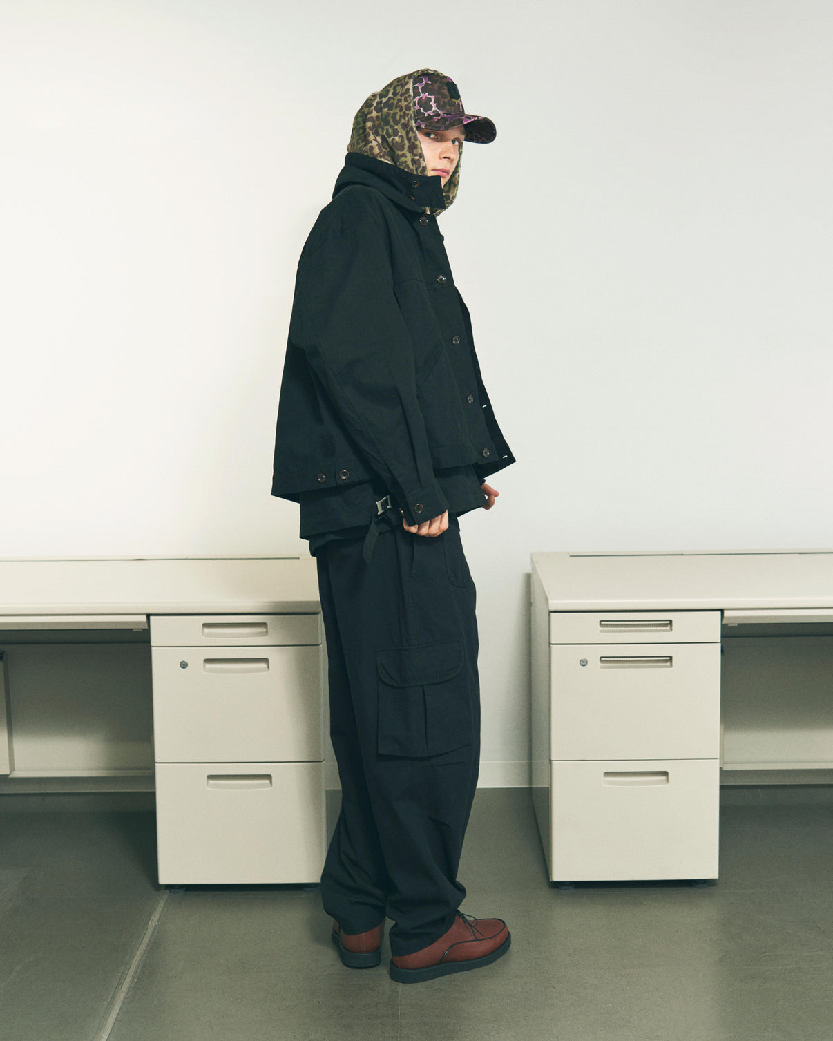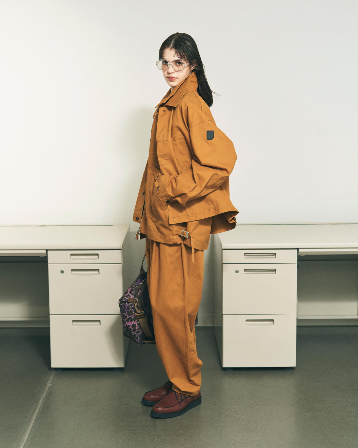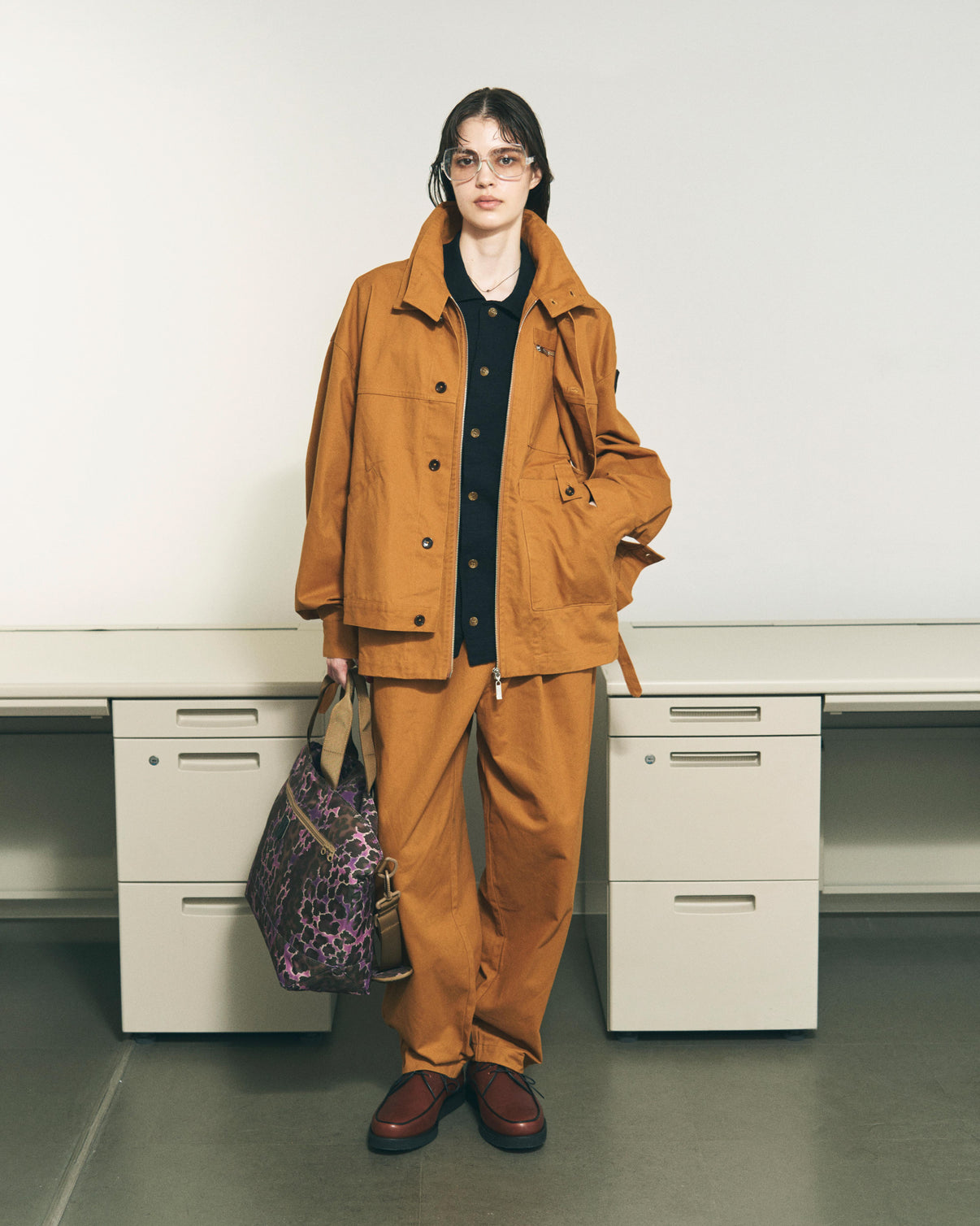 光沢とウェイトを併せ持つツイルチノを使用した、ベスト+ショートコートがレイヤーとなったスタイルのオリジナルワークジャケット、 重ねのインナーベストはネックディテール+ジャケットよりも少し長めの着丈になっており、対になる事でスペースを補い合い現代的なボリューム感のワークジャケットが完成します。 トップジャケットを開けたときにチラッと見える、ベストのユーティリティディーテールや、同素材の重なりの中での、ボタンとファスナーのコントラストもクール。もちろん別々で着るとそれぞれ別のテイストでの着こなしが可能です。内外の重ねを逆にするとベストのディテールがより活かされる、着こなしを楽しくするディテールのつまった定番アイテムです。