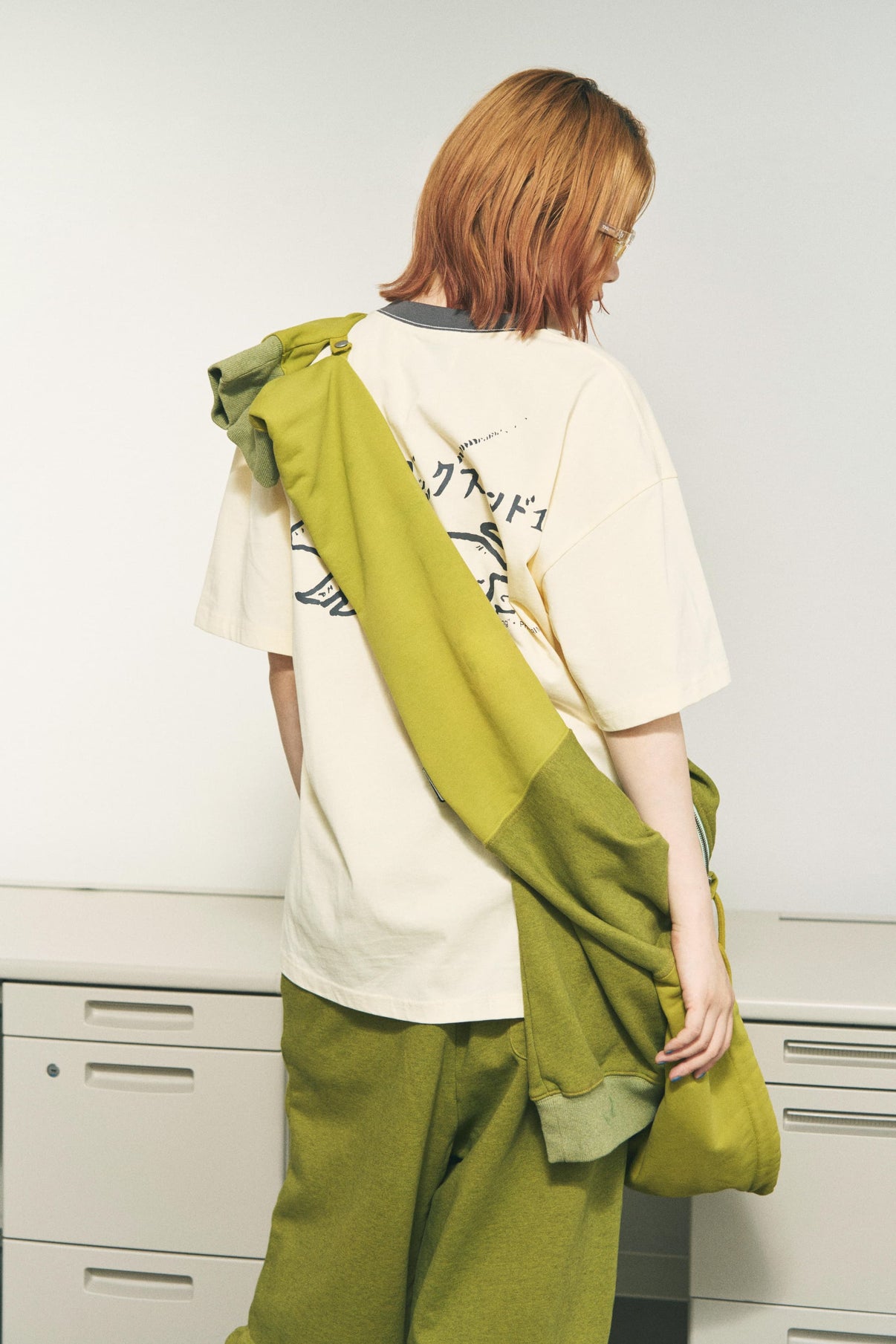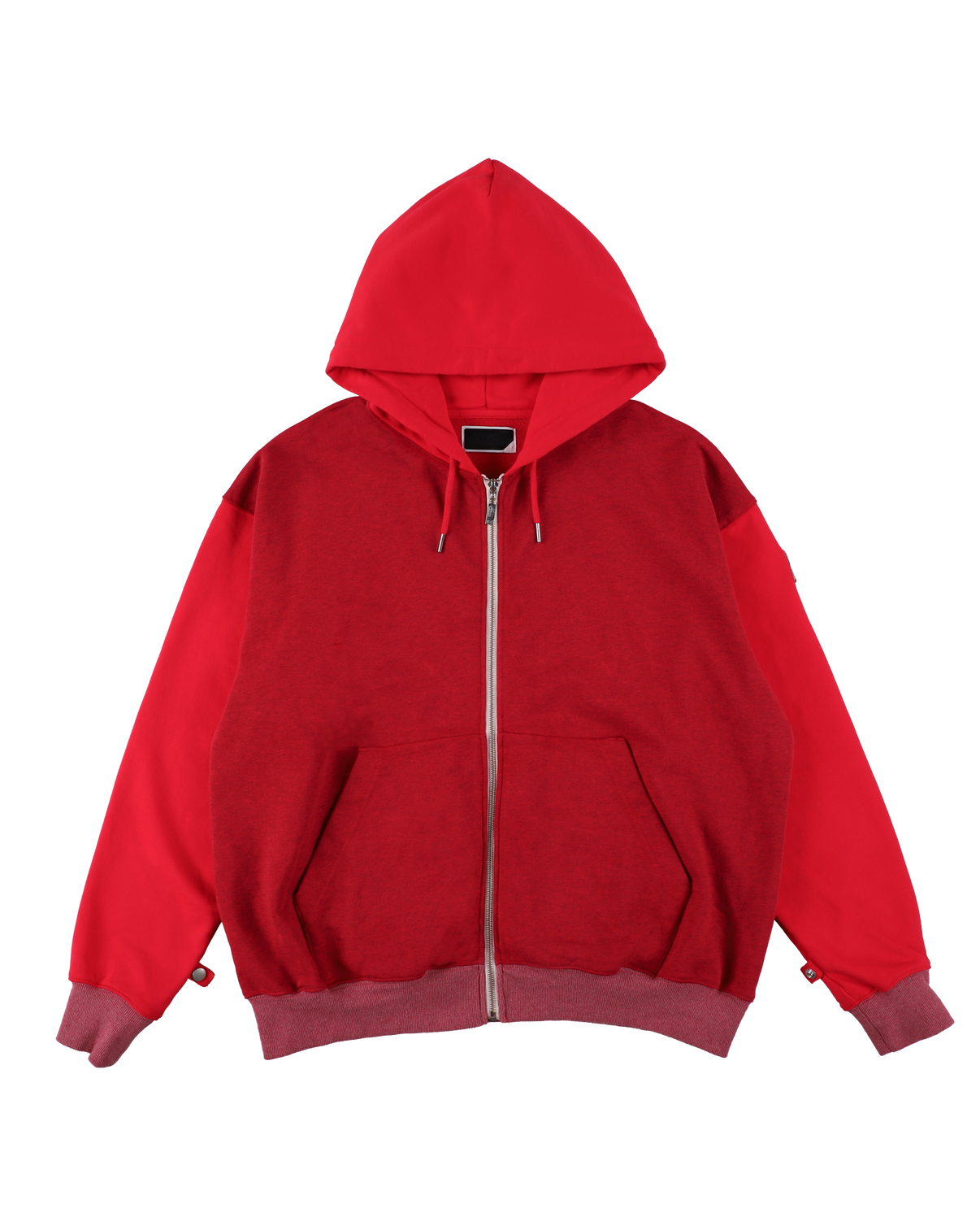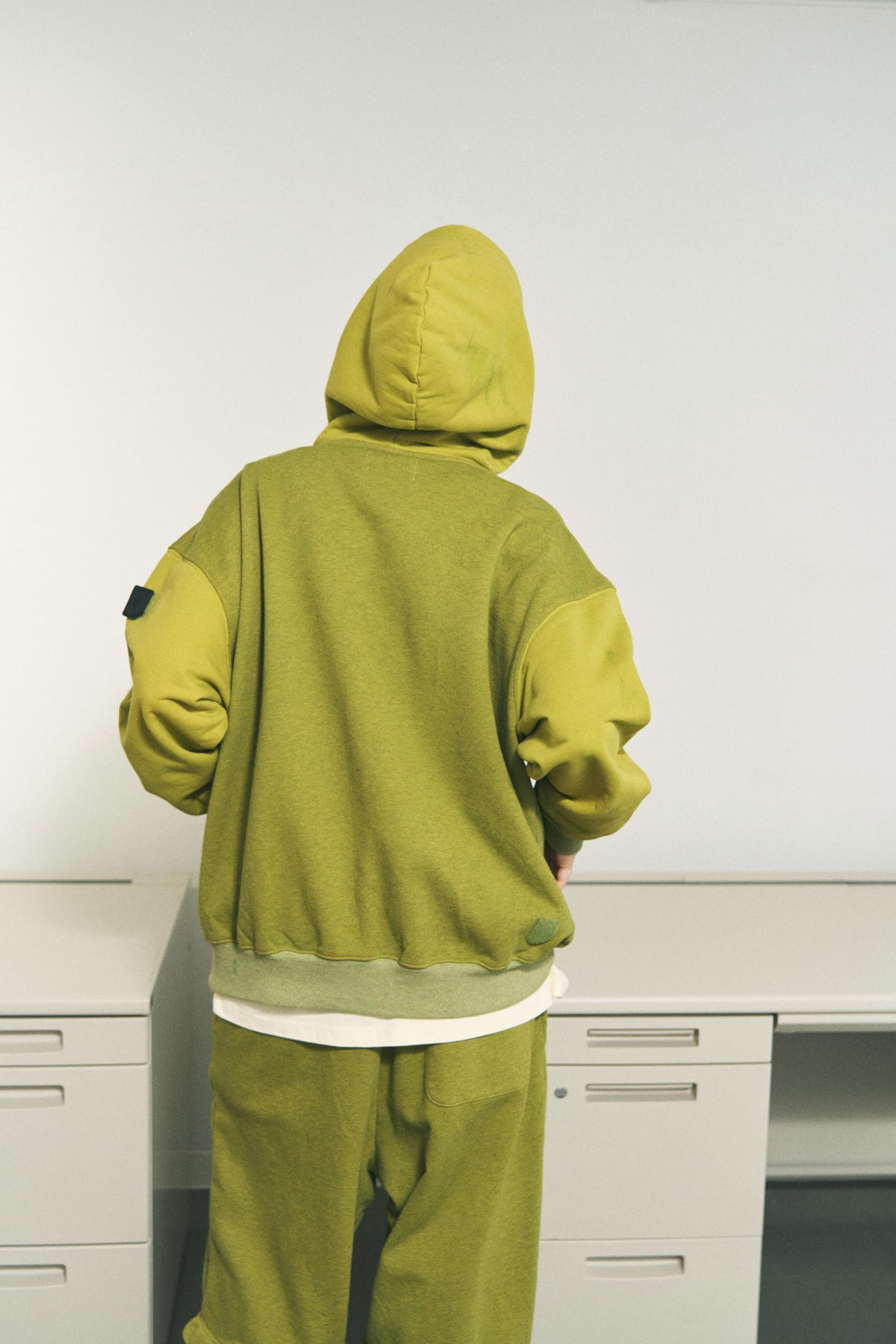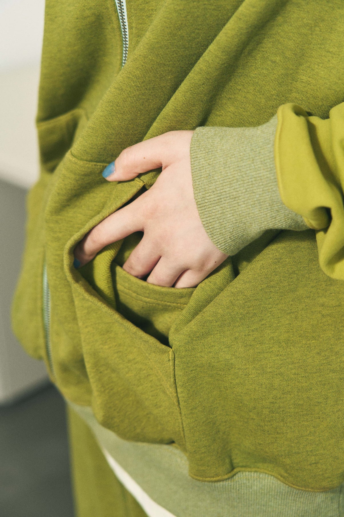 杢グレーのスウェットと袖を別色で切り替えたパーカをオーバーダイし、それぞれのパーツのナチュラルな切り替えを楽しめる、 ワントーンの配色ジップパーカーです。